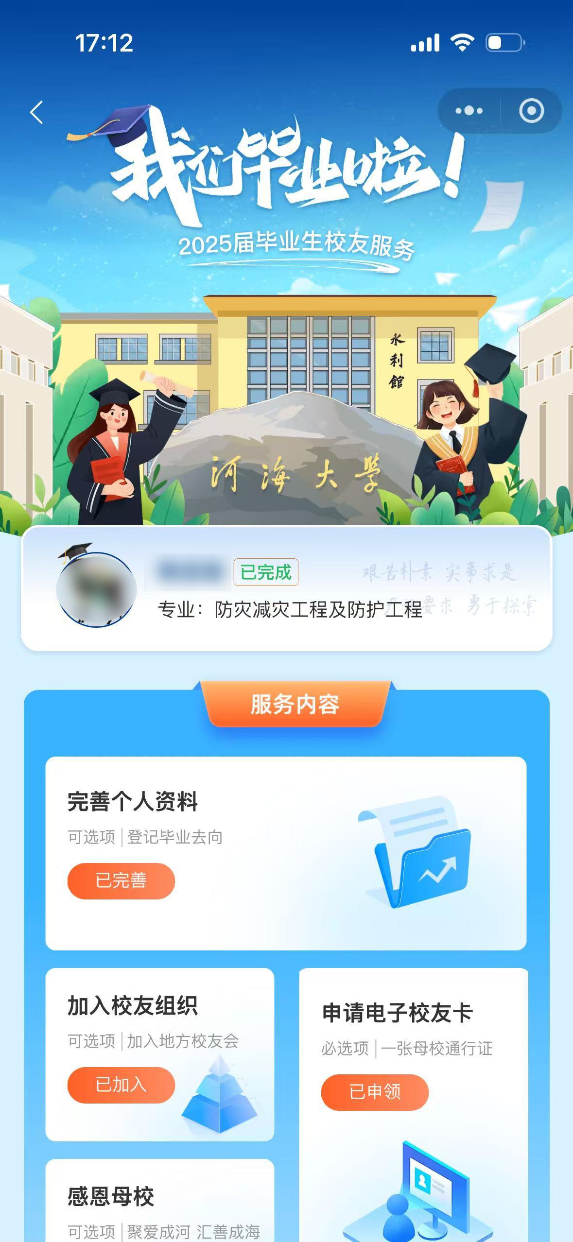 在微信搜索小程序“河海校友”,或扫描下方小程序码进入“河海校友”小程序。应届毕业生点击小程序服务大厅的【准校友服务】菜单即可进入专属的服务页面,完成服务内容加入校友会大家庭。